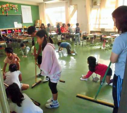 今年度の重点目標の一つとしての実践ですが、古い校舎をいつまでもピカピカにして使いたいと思っています。低学年は、無駄なおしゃべりをしないでお掃除をしています。