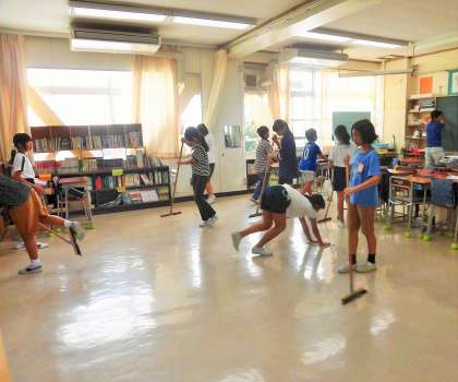 砧小学校の自慢は、上級生になればなるほど、一生懸命に床を掃いたり磨く子どもたちです!よき手本である上級生の姿を見て、下級生の心が育っています。