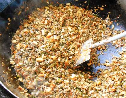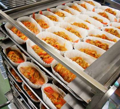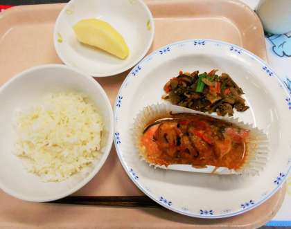 今日の給食は、[魚のちゃんちゃん焼き]です。ちゃんちゃん焼きは、北海道の郷土料理です。給食では、鮭の上にみそ味に仕上げた野菜いためをのせて、オーブンで焼いて作りました。子どもたちには、日本各地に伝わる郷土料理を知ってほしいと思っています。