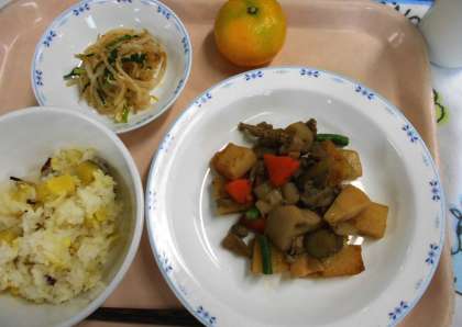 今日の給食の主食は、[さつまいもごはん]です。秋の味覚のさつまいもは、食物せんいやビタミンCが豊富です。やさしい甘さのさつまいもを子どもたちには好きになってほしいと思います。