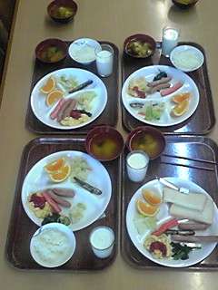 朝会ではラジオ体操で心身ともに目覚めさせ、朝食をいただきました。バイキング料理をみんなで楽しみました。