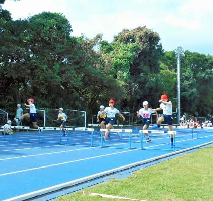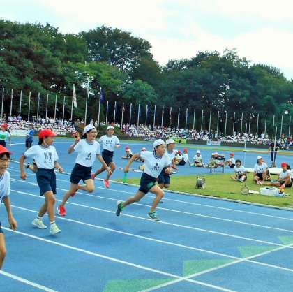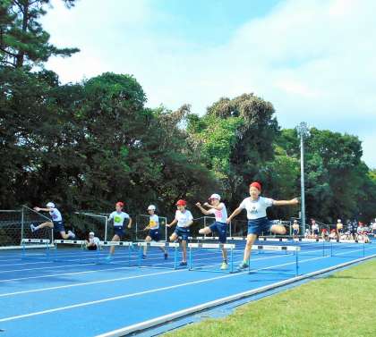 ハードル走、リレーの様子です。ハードル走は一番手前、リレーは中央が砧小学校です。