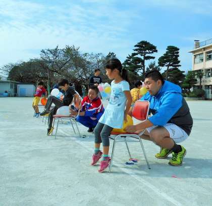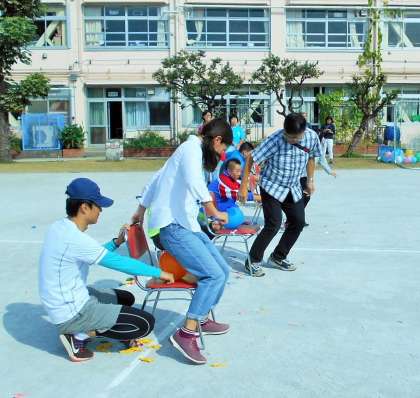 第1種目は風船割り競争、昔懐かしい競技です。私や先生たちも出場しましたがとっても楽しかったです!