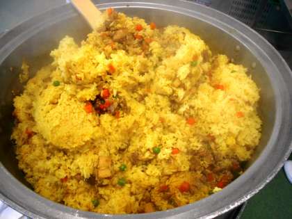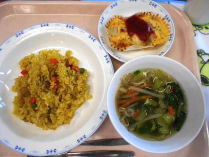 今日の主食は、[洋風たきこみごはん]です。ごはんを炊くときに、カレー粉と塩を加えました。具は、炊飯器の中にはいれずに、別に炒め、中濃ソースとカレー粉、塩で味をつけました。