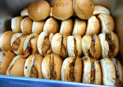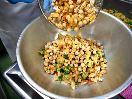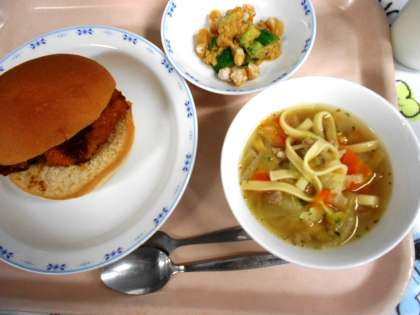 今日は[フィッシュサンド]です。魚は、メルルーサを使いました。魚が苦手な子どもたちも、油で揚げると食べやすくなります。副菜の[ビーンズサラダ]は、油で揚げた2種類の豆を使っています。食べやすい仕上がりになりました。