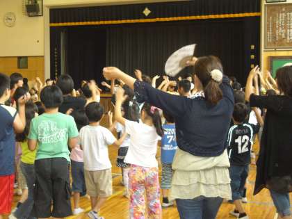 7月17日の砧っ子夏まつりに向けて、2年生は5年生と一諸に盆踊りの練習をしました。