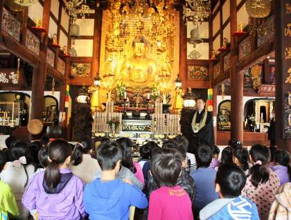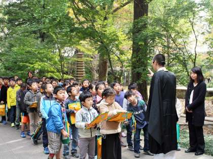 紅葉が始まった九品仏浄真寺に到着です。九品の意味や、九品仏に古くから伝わり社会科資料集にも載っている伝統行事の「おめんかぶり」の話を、お寺のお坊様に伺いました。また、手を合わせるということは、右手が相手(仏様だったり、食事を作ってくださった方だったり)、左手が自分、その二つの手を合わせて感謝の気持ちを込めるという意味があるのだそうです。