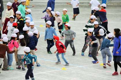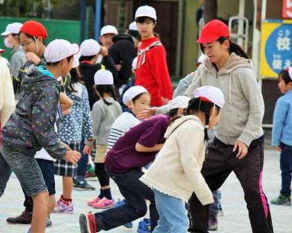 今朝の児童集会は集会委員会によるゲーム集会です。白帽子をかぶった子どもたちは、赤帽子をかぶっている先生や友達からタッチされないように十字の道を走って渡ります。タッチされてしまったら鬼になります。時間の経過とともにどんどん赤帽子が増えていきました。私も前回に引き続き、紅白帽をかぶり鬼役ですが、子どもたちは元気いっぱいです!