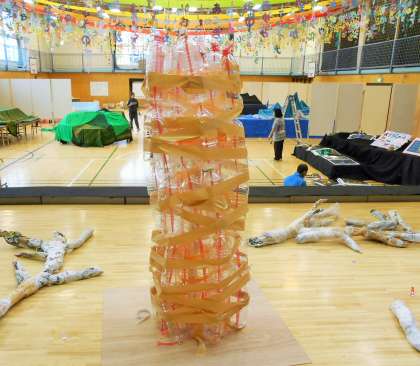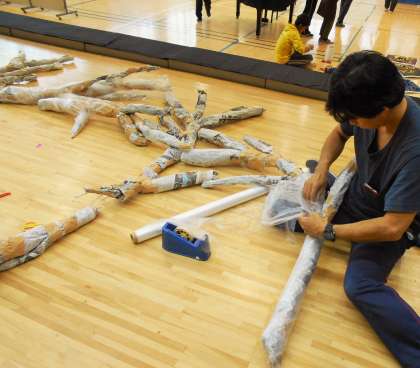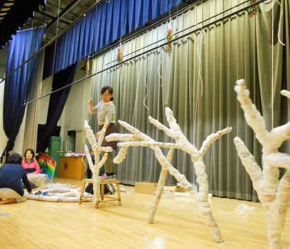 今週末の展覧会に向けて、全学年で取り組んでいる「砧っ子の百年桜」の制作中です。5年生が作った木の枝に・・・