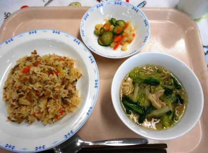 今日の副菜は、[カリフラワーの中華あえ]です。カリフラワーは、ブロッコリーと同じ花野菜です。あまり食べ慣れていない子も多いようでした。