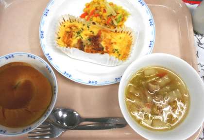 今日は、野菜をたくさん使ったメニューです。野菜が苦手な子も多いようですが、風邪をひかないようにするためにも、野菜をしっかり食べてほしいと思います。