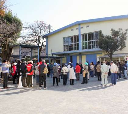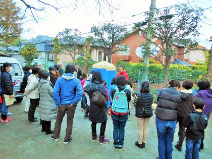 避難所が開設された場合は、運営本部長が中心となり、総務・情報、避難所、給食・物資、救護・衛生の4つの組織に分かれ活動をすることになっています。今日は防災倉庫の見学、仮設トイレの設置、バーナーの使い方、校舎内施設めぐり等を実施しました。