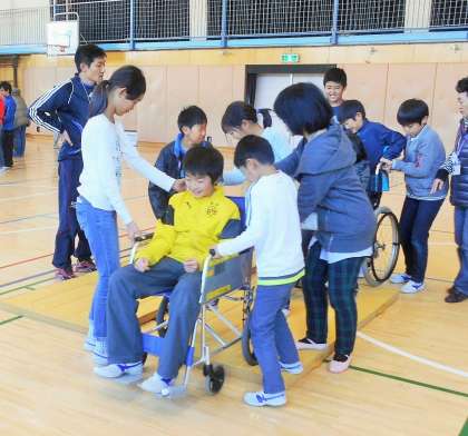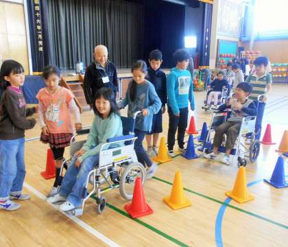 4年生は総合的な学習の時間に、車椅子&アイマスク体験を行いました。