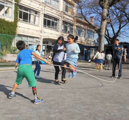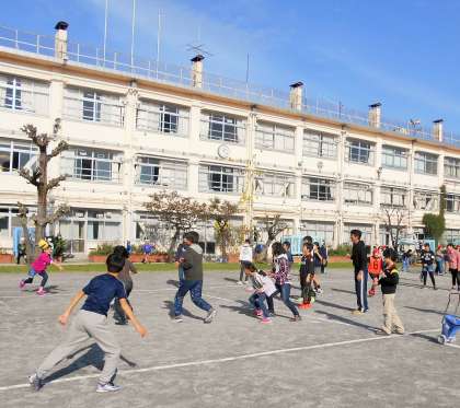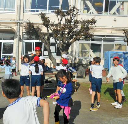 休み時間は先生と一緒の「共遊び」です。先生も一緒になって遊びます。砧小学校の特色の一つとして、「教師は常に子どもと共にある」という考えをもちながら行動していきます。副校長先生も一緒になって遊んでいます!