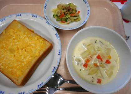 今日のスープは、たくさんの野菜とベーコンが入り、牛乳たっぷり栄養満点の[ポテトスープ]です。子どもたちは喜んで食べていました。