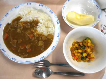 今日の給食は[大根カレー]です。12月の献立表を配布したときに、「大根カレーって、何ですか?」と質問にきてくれたクラスもありました。カレーに入っている野菜と言えば、じゃがいもや玉ねぎ、にんじんを思い浮かべる人も多いのではないでしょうか?今日は、旬の大根を子どもたちの好きなカレーに加えてみました。さっぱりした味のカレーに仕上がりました。