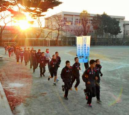 世田谷子ども駅伝に向けての朝練習10日目です。朝7時集合での合同練習会は、決して楽なものではありませんが、子どもたちは真剣に全力で取り組んでいます。練習会には、校長先生をはじめ、多くの先生方が応援、引率等で見守り励ましてくださっています。今日は「砧の学び舎」のぼり旗(デザインは中学生)も出来上がりお披露目をしました。今後も練習を重ね、大会に向けて取り組んでいきます。ご声援よろしくお願いします!