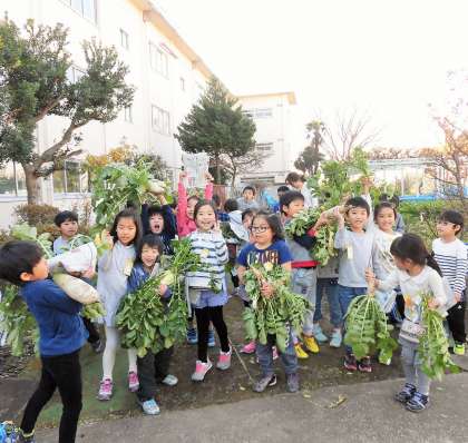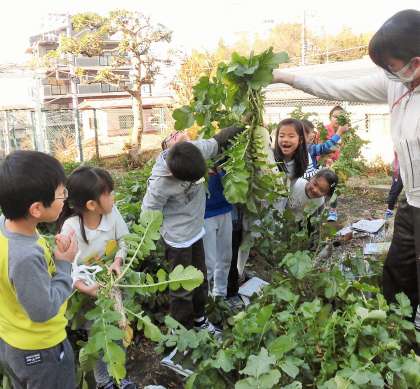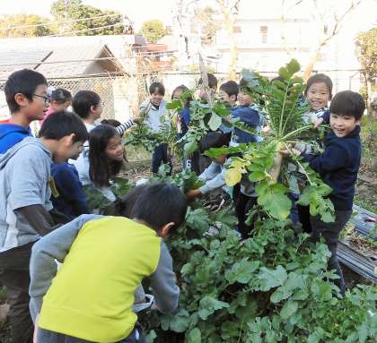 今日は1年生が大根を収穫しました。自分たちで育てた大根なのでみんな大喜びでした。9月の小さな種まきから、見事に大きく成長した大根が土の中から顔を出すと、子どもたちは歓声を上げ喜んでいました!