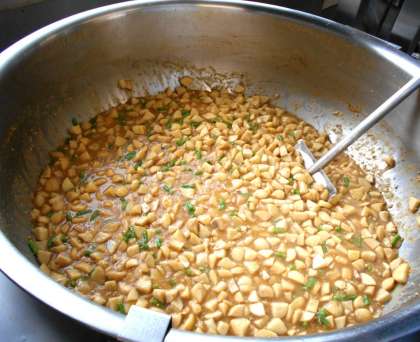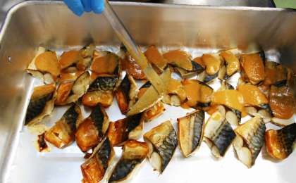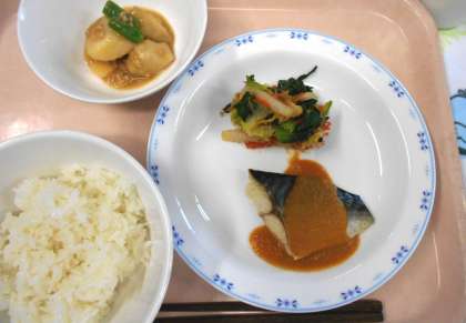 今日の給食の主菜は、[魚のピリ辛ソースかけ]です。焼いたさばに、みそとごま油にすりおろしたりんごやにんにくを加えたソースをかけました。白いごはんがすすむ1品となりました。