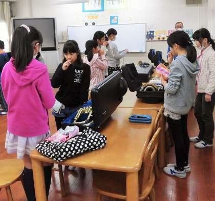 砧小学校の特色の1つである鼓笛の引き継ぎがありました。6年生が5年生に、優しくていねいに楽器・フラッグの扱い方から技まで、自分たちが習得したものを教えていました。