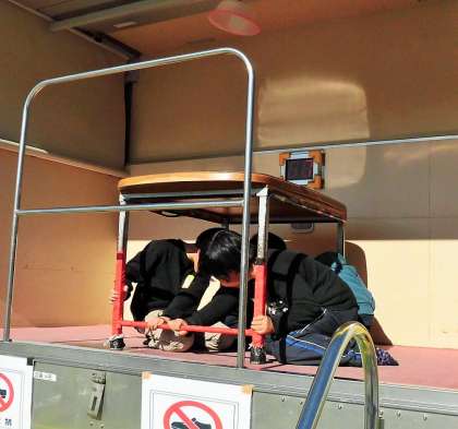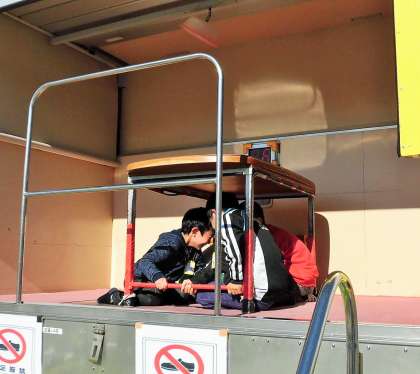 4〜6年生の代表児童と3年生は避難訓練後に起震車体験をさせていただきました。震度7までの揺れを体験しましたが、しっかりとテーブルの柱につかまっていないと吹っ飛んでしまいます。おへそを見るようにして頭を低くするなど、命を守る方法を教えていただきました。