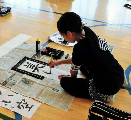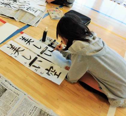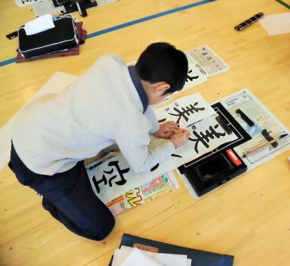4年生の書き初め会です。体育館の中は、張りつめた空気で私語はほとんどありません。正座、黙想をして心を落ち着かせ、集中をしてから一気に書き上げていました。4年生は高学年に向けて、緊張感のあるスタートを切りました。