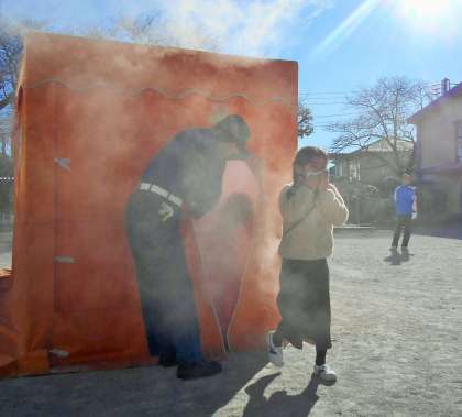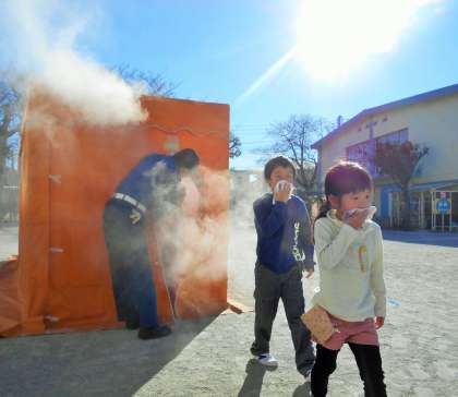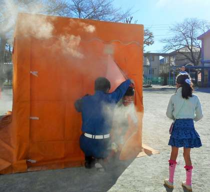 各クラスの代表児童と5年生は煙体験を行いました。煙の中はまわりが全く見えません。手探りで姿勢を低くして、歩きながら出口までなんとか歩いていました。世田谷区災害対策課の方々のご協力に感謝いたします。