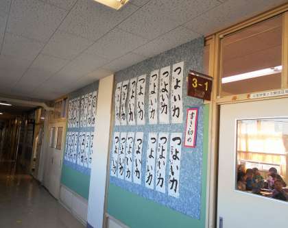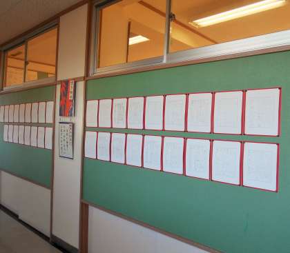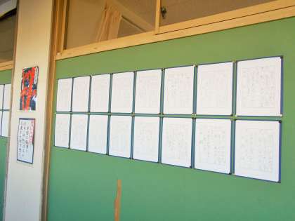 1年、2年は硬筆です。特に1年生は、初めての書き初めで緊張して書いていました。3年生からは毛筆です。