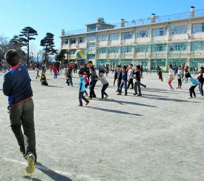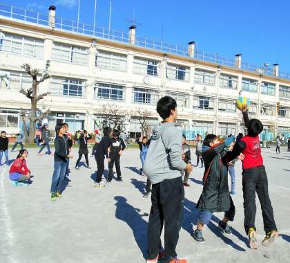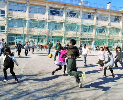 砧小学校の特色の1つに、休み時間は先生と一緒の「共遊び」があります。 遊びを通して、授業中だけでは分からない、一人一人の良いところに気づいたり、ほんの小さな変化や情報も、この共遊びの中から得られればと思っています。休み時間の校庭は笑顔がいっぱいです!