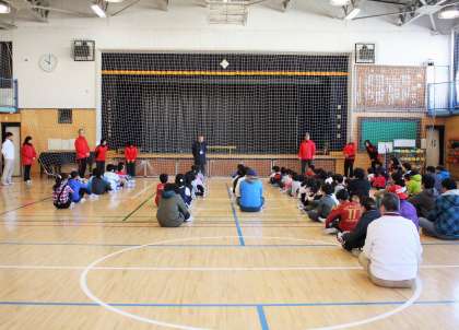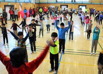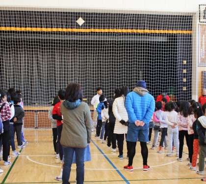 今日は、遊び場開放運営委員会主催「ニュースポーツを楽しもう!」です。ポカポカ陽気の中、親子一緒にみんなでニュースポーツを楽しみました。まずは開会式と準備運動です。多くの子どもたちの参加があり、運営委員会の皆さんも喜んでいました。