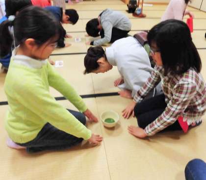 お茶の飲み方は、「おてまえをちょうだいいたします。」と、お茶碗を時計まわりに2回まわす。そしてゆっくりお茶を飲んで、飲み口を親指と人さし指でぬぐう。茶碗を正面にもどすことなどを教えていただきました。茶道を通して日本の心が伝わったことと思います。
