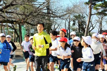 ウォーミングアップ開始です。子どもたちは駅伝選手のもとでとっても楽しそうです。