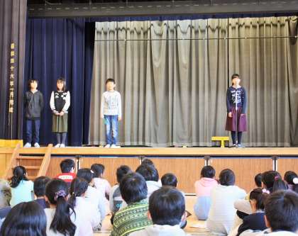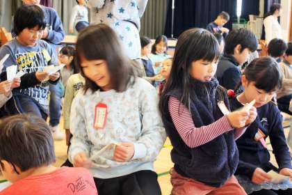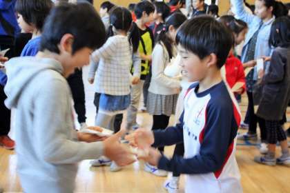 今朝の児童集会は集会委員会による「お金ジャンケンゲーム」集会です。ルール説明の後、なかよし班の班長さんから、一人に3枚ずつ「きぬた銀行」のお札が配られました。他の班の人とジャンケンをして勝ったらお札を一枚もらいます。