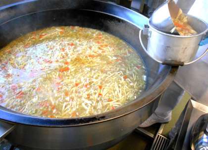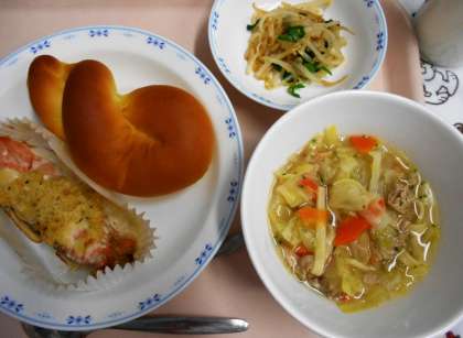 今日の汁ものは、<ヌードルスープ>です。子どもたちは、ヌードルや春雨など、麺が入っていると野菜たっぷりのスープでも、もりもり食べています。今日も<ヌードルスープ>は、どの学級もよく食べていました。