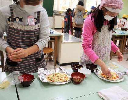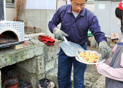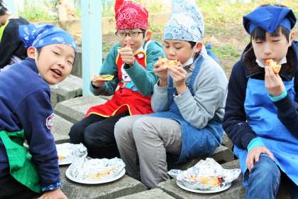 6年生は「ピザを作って卒業を祝おう」です。多くの保護者の方々にサポートしていただき、ピザの生地の作り方や伸ばし方、トッピングの仕方など、丁寧に教えていただきました。手作りピザ窯の炭火で焼いた熱々のピザは、もっちりとしてとってもおいしく、みんな「おいしかった!」「楽しかった!」と、とっても嬉しそうでした。