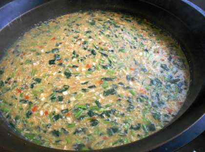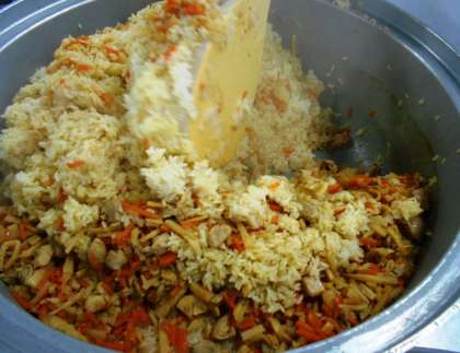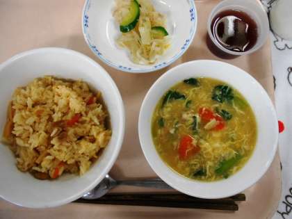 今日の主食は、<中華おこわ>です。給食のおこわは、もち米と米をあわせて炊きます。今日は干しえびやたけのこを使い、中華風の味付けに仕上げました。子どもたちは、よく食べていました。