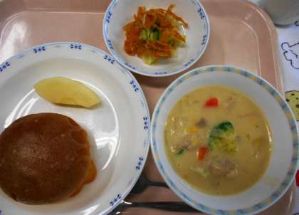 今日の主食は、6年生からリクエストがあった<ビスキュイパン>です。ミルクパンの上にクッキー生地をのせて、オーブンで焼きました。「今日のパン、甘い香りがしておいしかったです!」という嬉しい声も聞くことができ、残食も少なくよかったです。