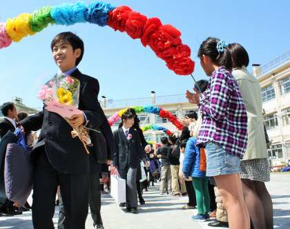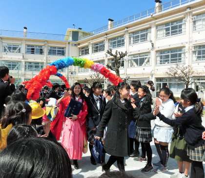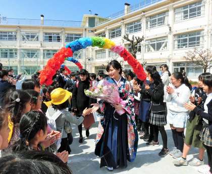 校庭に花道をつくり、みんなで6年生を送り出しました。