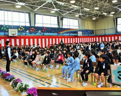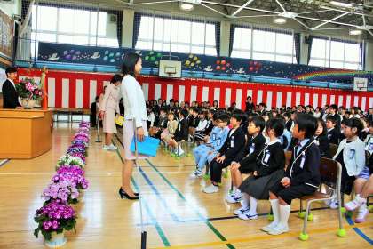 担任の先生の発表と、6年生代表児童による「歓迎の言葉」です。さすが砧小学校の6年生です。1年生が安心できる、心のこもった歓迎の言葉でした。