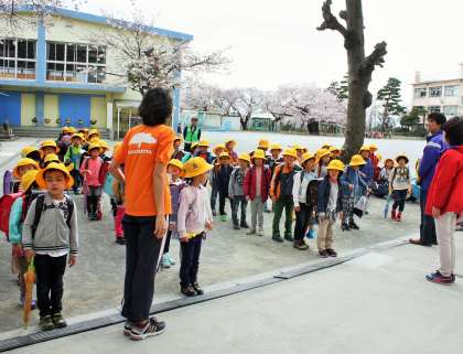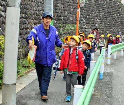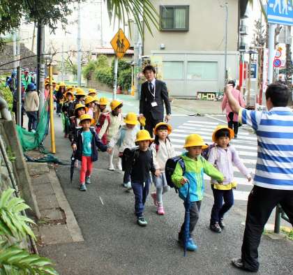 今日の1年生は集団での下校です。この時期は、コース毎に1年生の担任と専科・ことばの教室の先生、主事がついて、集団で下校しながら正しい通学路を覚えます。メーンの通りから曲がる道をしっかりと覚えていきます。