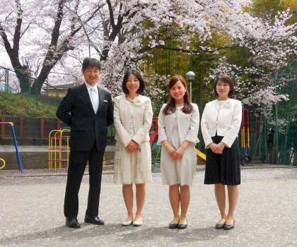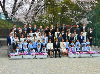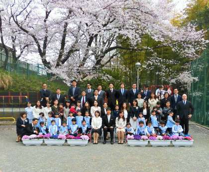 満開の桜をバックに記念撮影です。明日から、元気に登園してください。