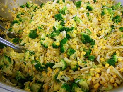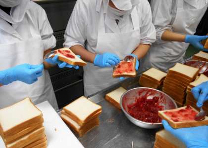 今日の給食の副菜は、<春野菜のサラダ>です。砧小学校の給食では、野菜は機械では切らず、調理員が手切りをしています。ドレッシングも手作りしています。