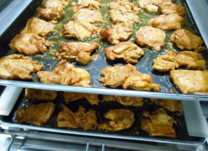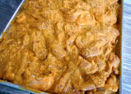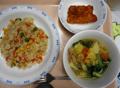 今日の主菜は、<タンドリーチキン>です。カレー粉やヨーグルト、ケチャップなどをあわせた調味液に漬け込み、オーブンで焼いて作りました。教室をまわっていると、「今日のタンドリーチキンがおいしかったです。また食べたいです!」と話してくれた子がたくさんいましたのでとっても嬉しく思いました。