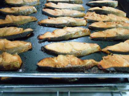 今日の給食は、主菜は<魚の照り焼き>です。魚は鮭を使いました。