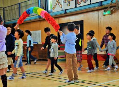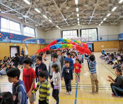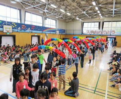 今日は1年生を迎える会です。まずは1年生と6年生が手をつないでの入場です。1年生は上級生の子どもたちの人数の多さに、少し緊張した面持ちでした。それをほぐそうとする6年生のやさしさが印象的でした!