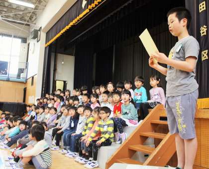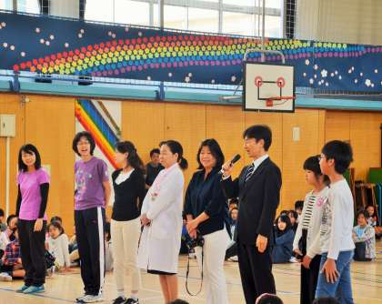 司会等は昨年度代表委員の子どもたちです。はじめに、歓迎の言葉や先生紹介がありました。