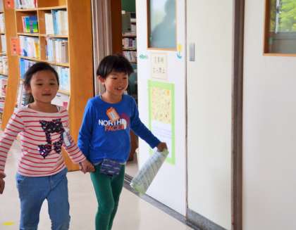 今日は2年生が、お兄さん、お姉さんとなり、1年生を学校探検(学校案内)に連れて歩きました。1年生と手をつないで、校長室、職員室、主事室、事務室、図書室など、校舎案内図を手にしながら、それぞれの場所で案内をしました。