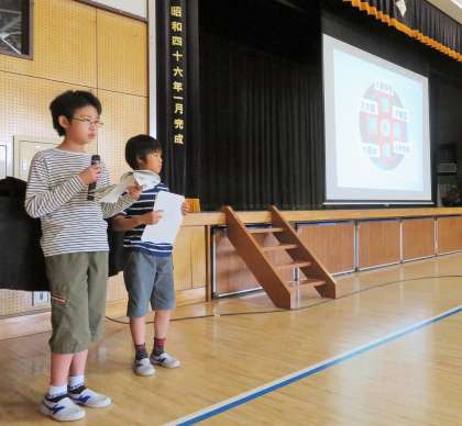 今日は砧小学校115周年開校記念日集会です。6年生の集会委員会の子どもたちが、砧小学校の歴史、校章の由来、砧に伝わる民話、そして、愉快なクイズを工夫して準備してくれました。校章の由来などがよくわかりました。
