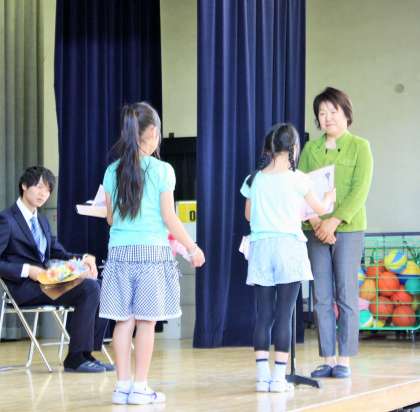 式場では、2年生から6年生の子どもたちが、ご出席の4人の先生方に心をこめてお礼をしました。一人一人の先生方に手紙を読む人、花束を渡す人が全校を代表して壇上に上がりました。