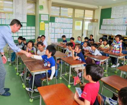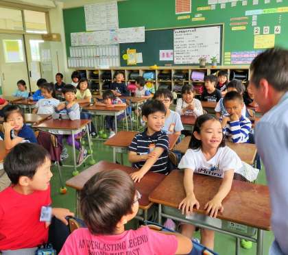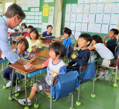 今日は1・2年生の英語活動です。カナダ出身のジェフ先生が今年度の砧小学校のALTです。もちろん担任の先生も一緒ですが、子どもたちの楽しそうなこと・・・。今日は、自己紹介をしたり、クイズをしたり、楽しく英語と親しみました。